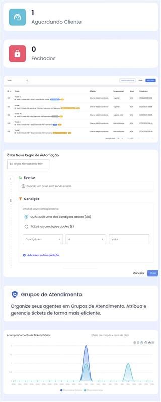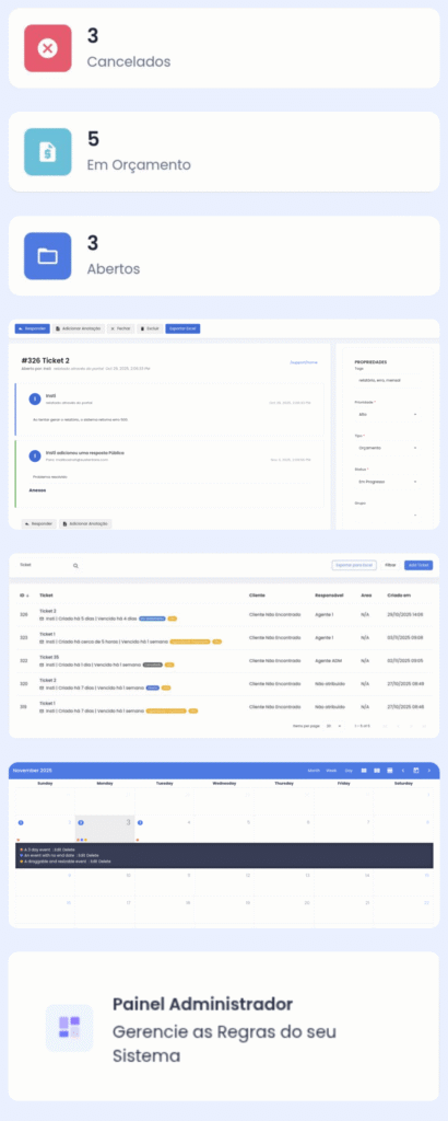 Dashboards por área, desempenho de equipes e cumprimento de SLA.